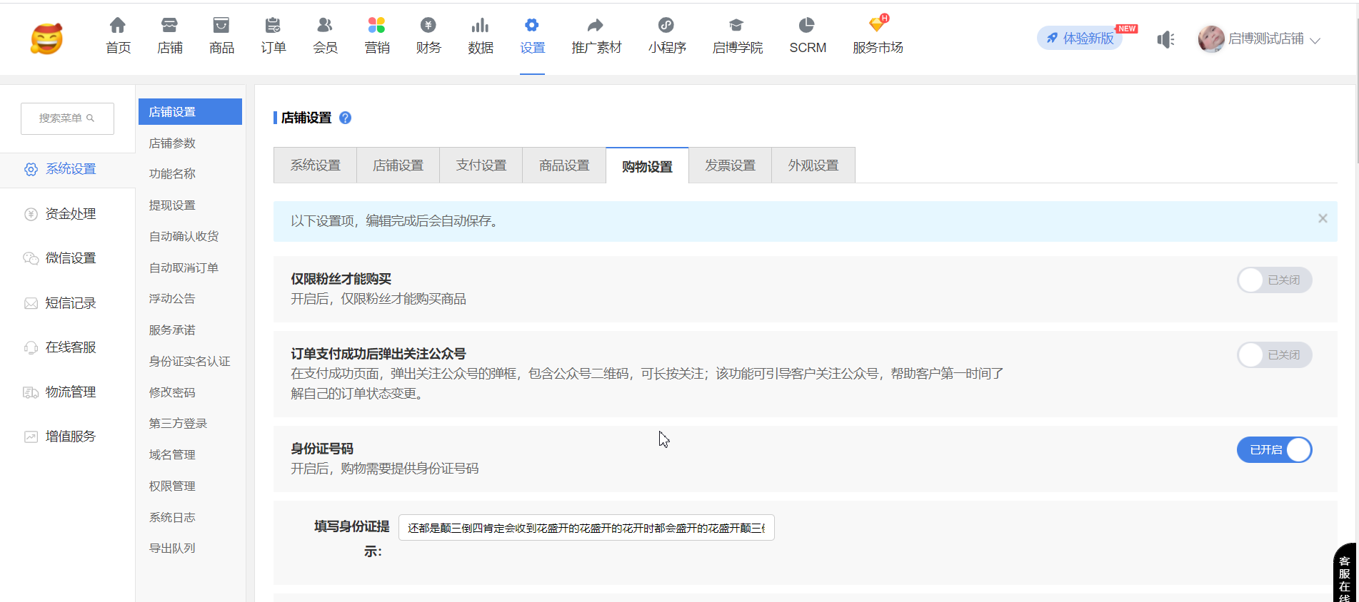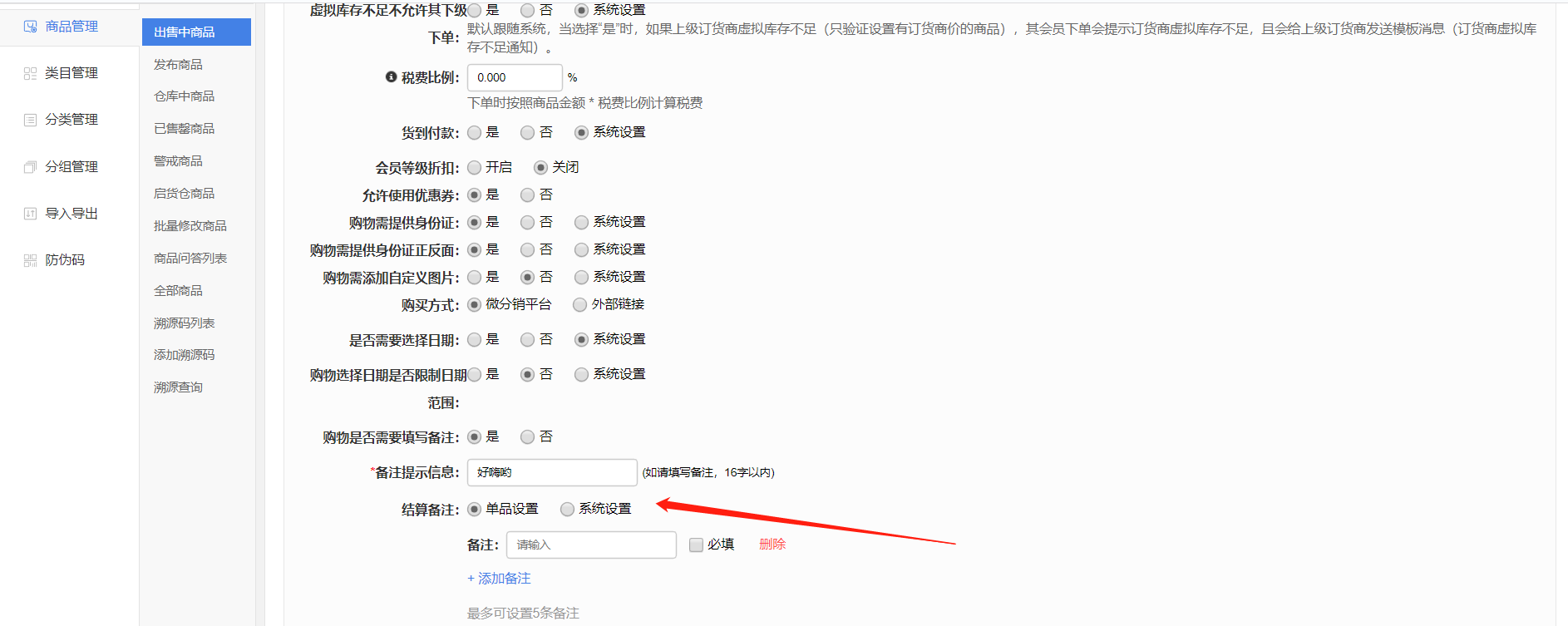 現(xiàn)邏輯:商品購(gòu)物設(shè)置-新增“結(jié)算備注”設(shè)置,支持針對(duì)單品設(shè)置還是走系統(tǒng)設(shè)置