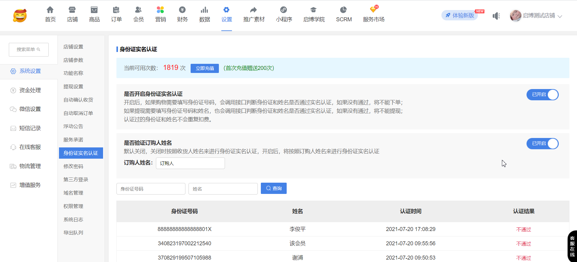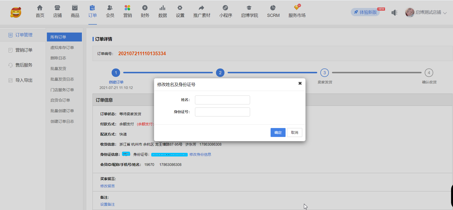 用戶場(chǎng)景:系統(tǒng)設(shè)置-店鋪設(shè)置-開啟跨境電商模式身份證號(hào)碼;同時(shí),系統(tǒng)設(shè)置-“身份證實(shí)名認(rèn)證是否開啟身份證實(shí)名認(rèn)證是否驗(yàn)證訂購(gòu)人姓名開啟后,在手機(jī)端訂單詳情可以修改訂購(gòu)人信息,后臺(tái)訂單詳情同步修改后訂購(gòu)人信息。