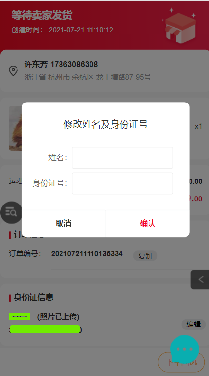 3)手機(jī)端物流詳情點(diǎn)擊編輯,彈出修改姓名及身份證號(hào)彈窗