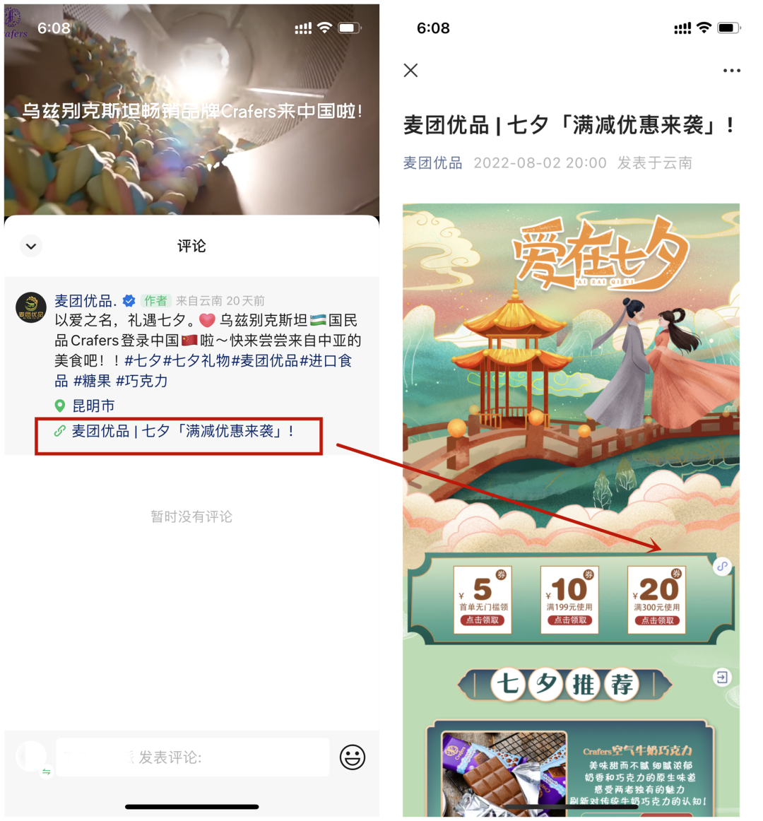 視頻號宣傳內(nèi)容為直播相關(guān)的主題宣傳片,和麥團直播上的直播主題進行同步聯(lián)動,比如最近的七夕節(jié)日營銷活動,點進視頻詳情頁中可以直達公眾號文章,即可獲取相關(guān)福利,主要的消費以及會員活動都集成在小程序中轉(zhuǎn)化完成。