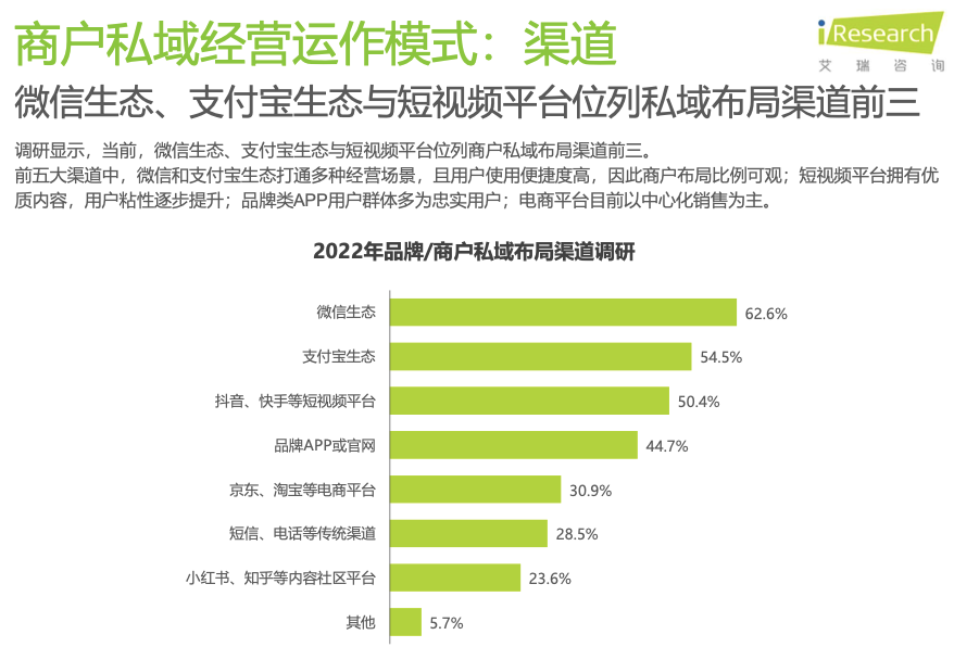 艾瑞的調研顯示,微信、支付寶和抖音等短視頻平臺成為私域布局前三大渠道。