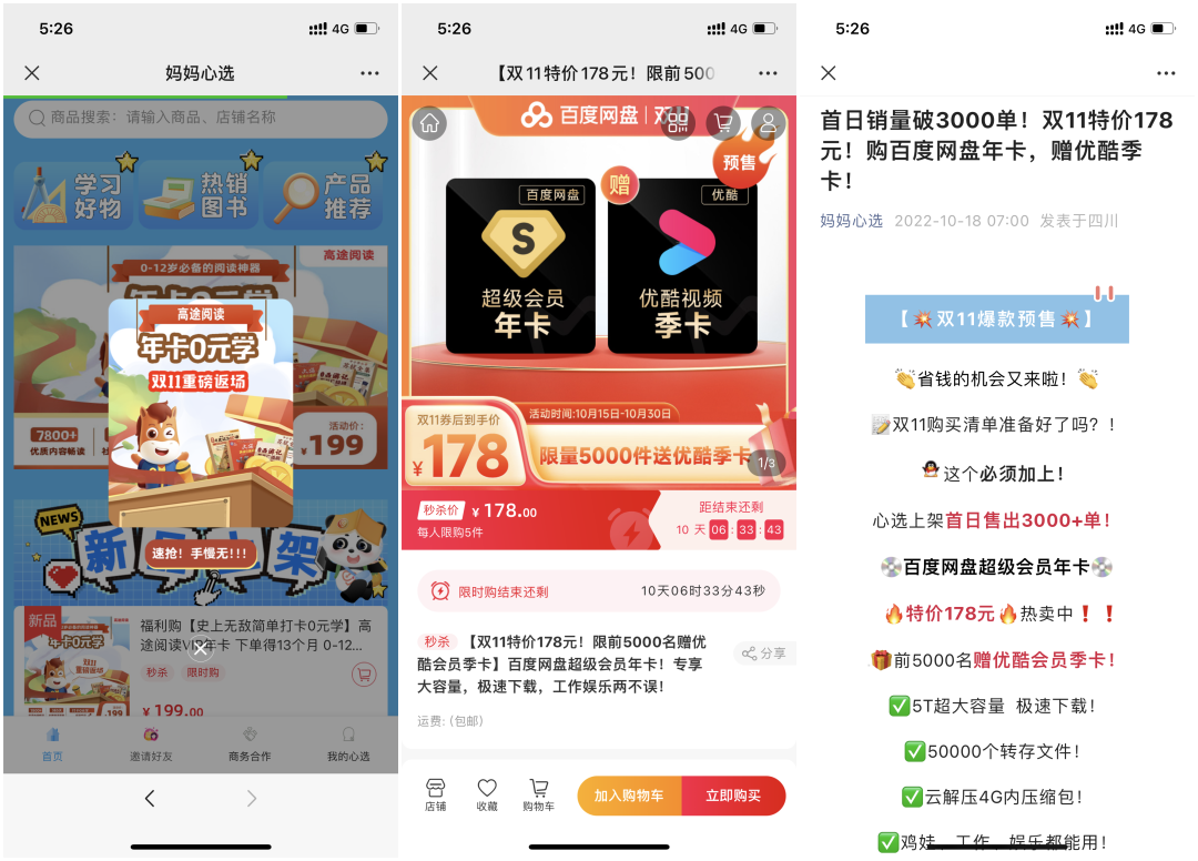 活動(dòng)玩法:打卡0元學(xué)活動(dòng)雙11返場(chǎng)。推出高途閱讀VIP年卡,限時(shí)199元搶購(gòu)。消費(fèi)者只要購(gòu)買后每天參與打卡任務(wù),會(huì)有年卡費(fèi)用返款服務(wù),為了提高活動(dòng)曝光量,只要有用戶進(jìn)入媽媽心選微商城,首頁(yè)就會(huì)有彈窗推送該活動(dòng)。