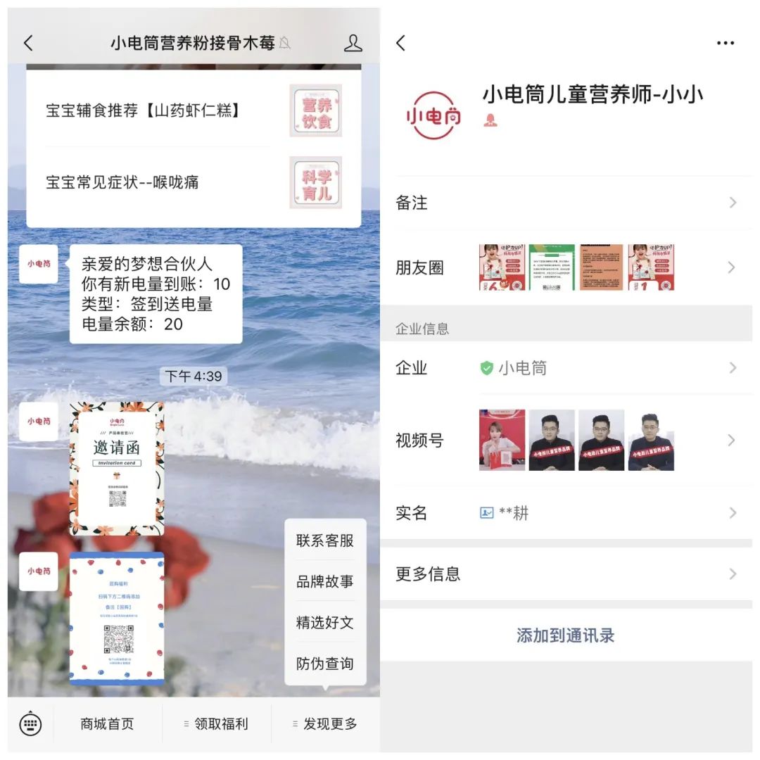 點擊視頻號的添加微信,會添加到一個叫小電筒兒童營養師-小小企微人設;