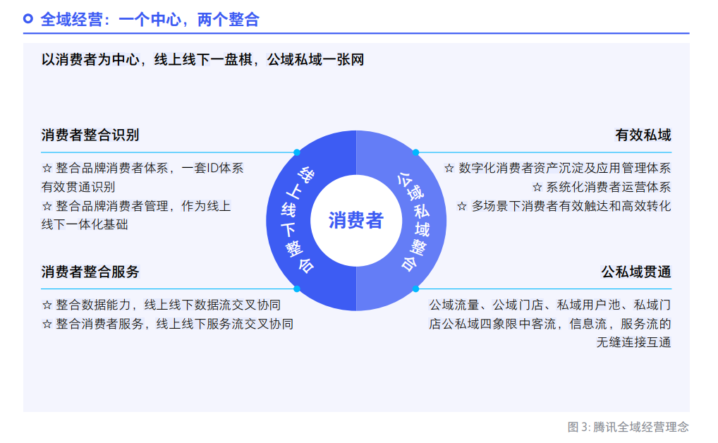 2022年,騰訊進一步將全域經營概括成“一個中心,兩個基本特征”,即以消費者為中心,以公域、私域整合和線上、線下整合為兩個基本特征。為了幫助企業實現以消費者為中心的目標,騰訊生態提供了多種工具,通過公域私域的貫通、線上線下的整合來實現目標。