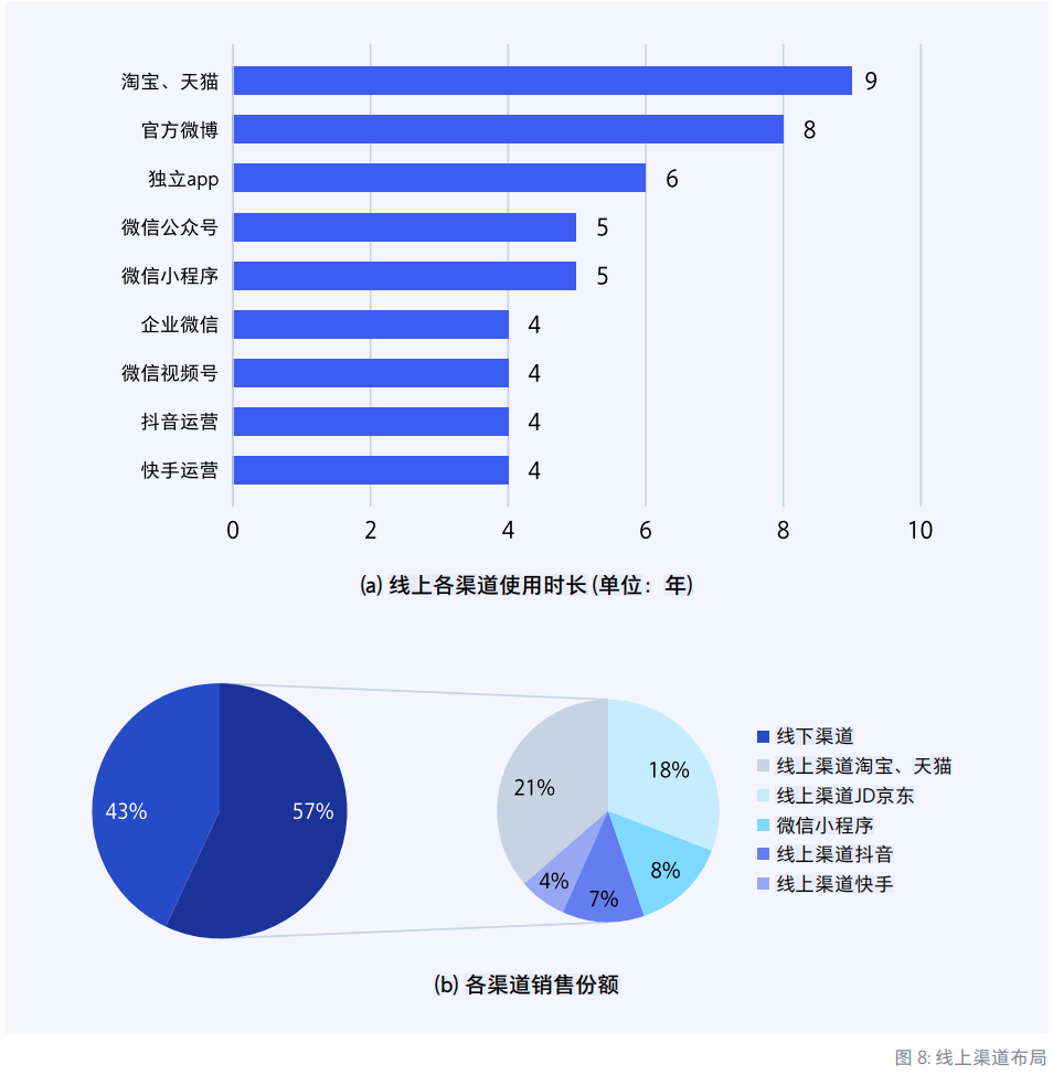 從圖中線上各渠道布局時間分布,在被調研的企業中,淘寶和天貓端的平均線上布局的時間布局時間最長(9年);其次是官方微博(8年);獨立app(6年);微信公眾號(5 年);小程序(5 年);最為年輕的渠道是企業微信、微信視頻號、抖音、快手,均為 4年。
