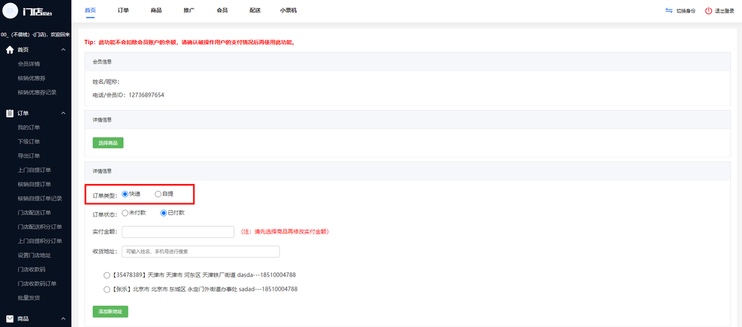 現邏輯:新增訂單類型,門店后臺創建訂單可以選擇快遞/自提
