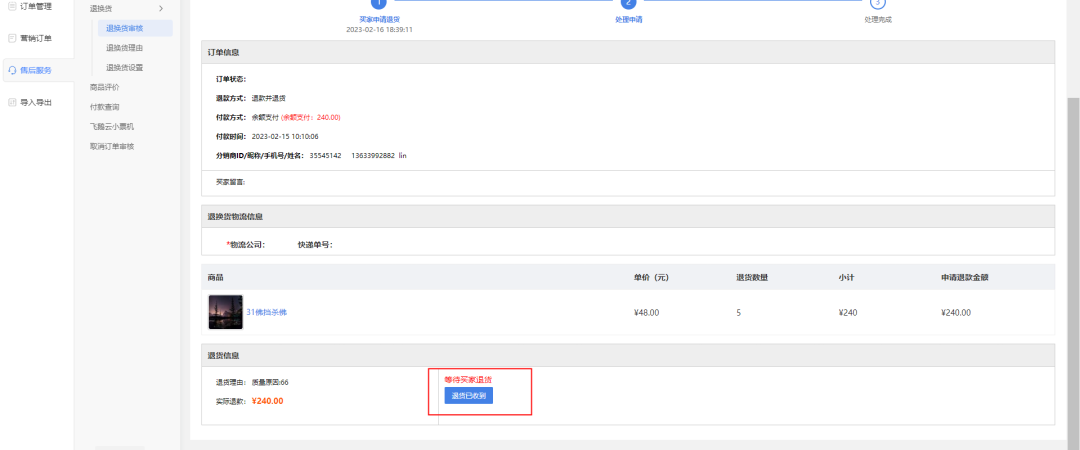 針對開啟新版退換貨流程之后,買家長期不填寫退貨快遞單號商城后臺新增操作按鈕,點擊“退貨已收到” 默認直接退款