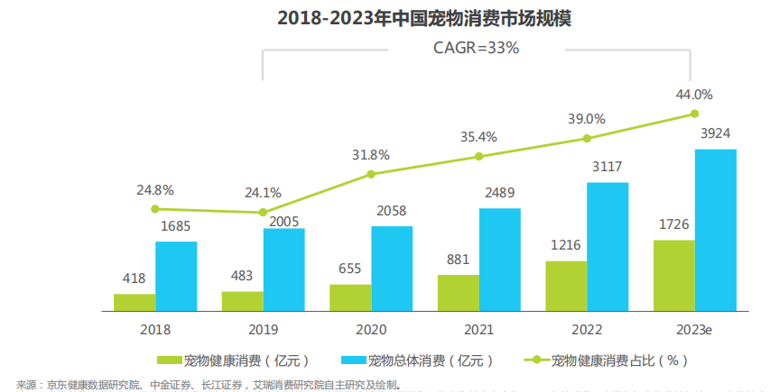 隨著國民收入水平的提升,消費不斷升級,同時人口結構發生變化,養寵人群不斷增加,寵物角色和養寵理念也發生轉變,寵物主消費觀念也向著品質化進行升級。寵物相關商品和服務需求越發多樣,國內寵物消費市場規模快速增長,2022年市場規模約為3117億元。隨著寵物家庭滲透率和行業成熟度持續提升,寵物消費市場未來依然會保持增長態勢,預計2023年市場規模約為3924億元,2019年-2023年復合增長率可達33%。