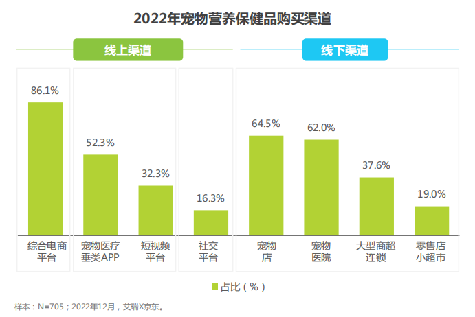 線上渠道中,綜合電商平臺已經成為寵物主購買寵物營養保健品的首要渠道,比例高達86%,其中,又以頭部電商(京東、淘寶)表現最為強勁,比例均超50%;此外,也有部分用戶會選擇寵物醫療垂類APP和短視頻平臺購買;線下渠道中,寵物店更受歡迎,有64.5%的寵物主在線下優選寵物店進行購買,其次是寵物醫院,占比約為62.0%。