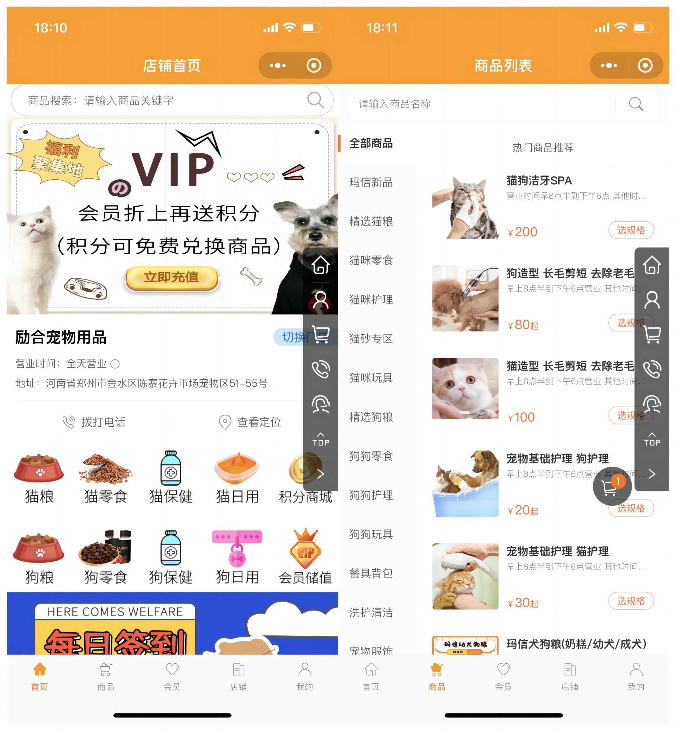 小程序商城內所有非服務類的商品,都支持到店自提或者快遞到家,消費者可以自定義選擇距離自己最近的勵合寵物門店自提。