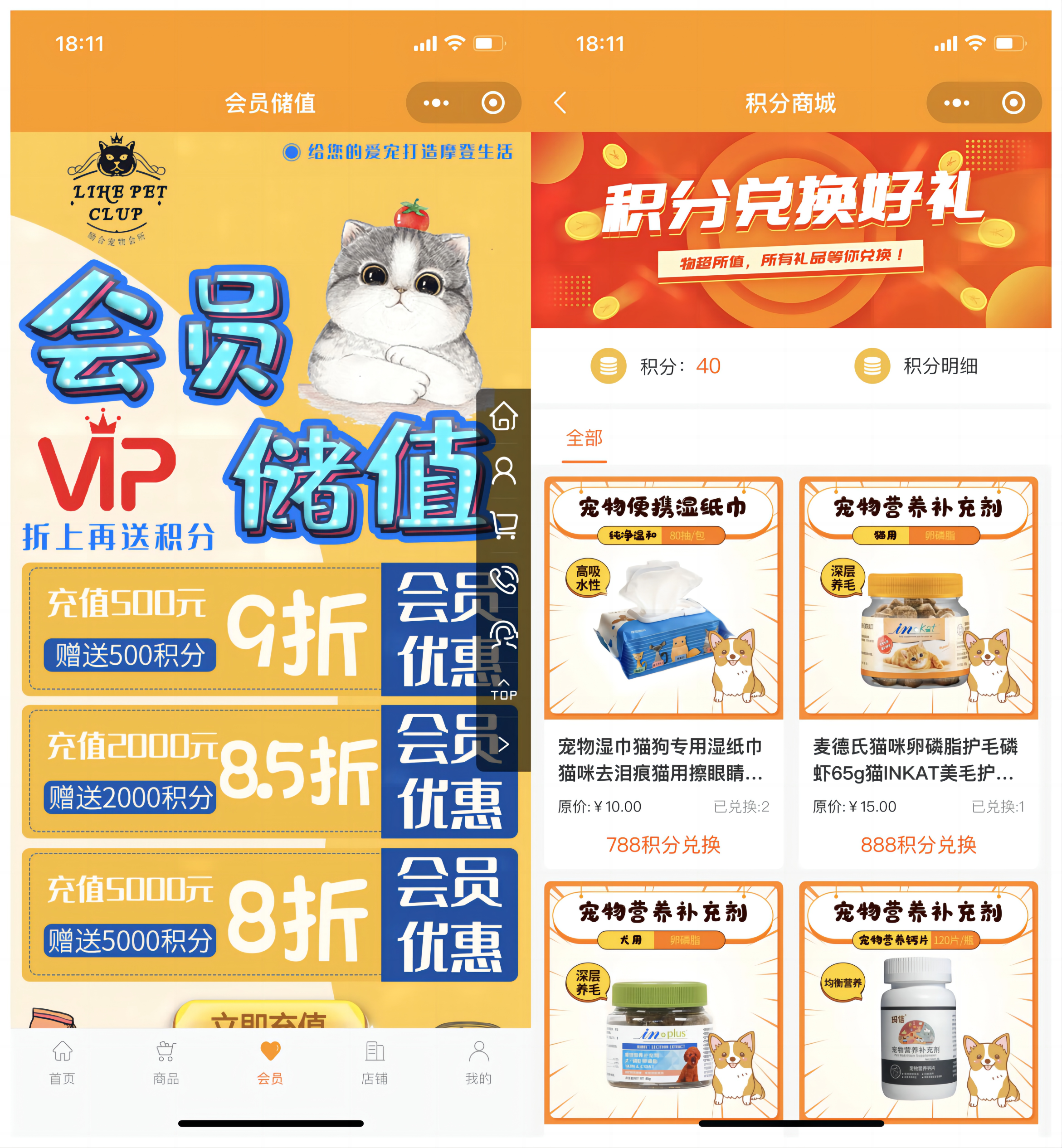 勵合寵物把低客單、復購高的商品,展示在積分商城,通過消費贈積分,消費者積累積分后兌換指定商品。寵物的口糧、用品等屬于消耗品,充值會員會比較劃算,設置了3重會員卡等級,引導更多客戶辦理會員卡。