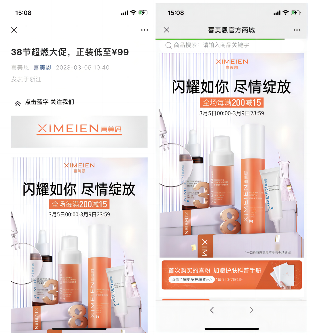 喜美恩逢38女神節(jié)上大促營銷活動,商城內(nèi)會上線特惠福利給到消費(fèi)者,如“滿減”、“買贈”等營銷活動。