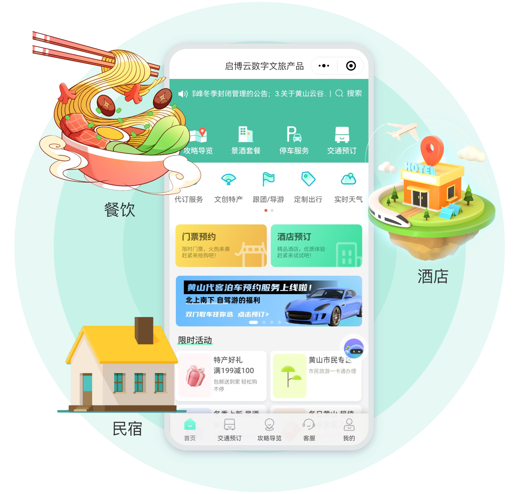酒店、民宿、餐飲: "打造一體化預(yù)訂平臺,整合酒店客房、民宿房源