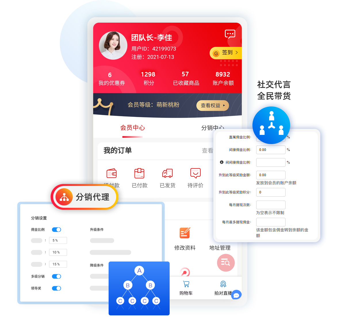 分銷(xiāo)代理模式社交分銷(xiāo),實(shí)現(xiàn)全民帶貨。以推客為中心,利用返傭機(jī)制,把用戶(hù)主動(dòng)