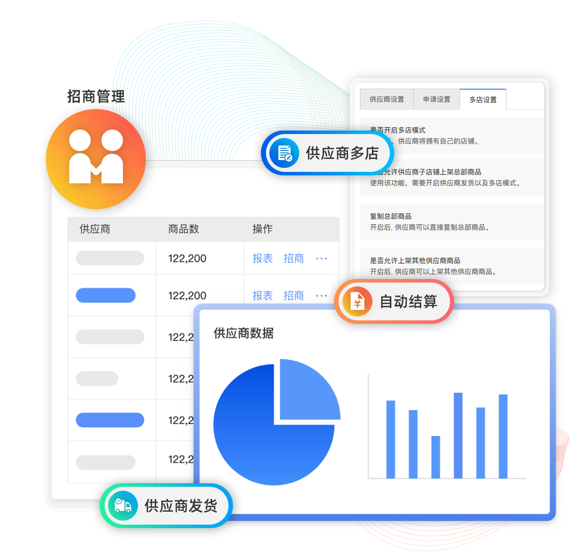 供應(yīng)商、訂貨商模式快速打造平臺(tái)運(yùn)營(yíng)模式,多供應(yīng)商入駐,支持供應(yīng)商發(fā)貨,分賬自動(dòng)結(jié)