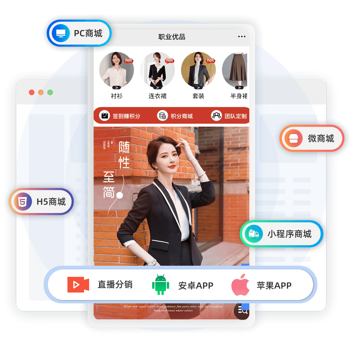 7大線上渠道,全線引流PC商城、微商城、小程序商城、H5商城、蘋(píng)果安卓APP商城、直播商
