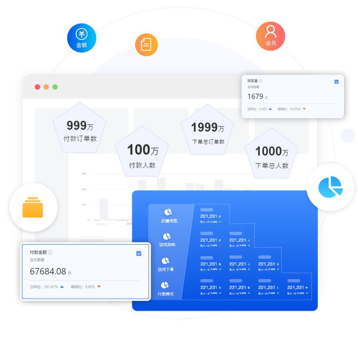 會(huì)員數(shù)據(jù)從累計(jì)粉絲、成交客戶(hù)數(shù)、粉絲活躍度、領(lǐng)券會(huì)員等深度洞察會(huì)員消費(fèi)