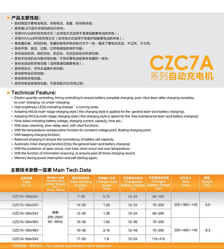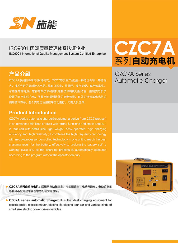 CZC7A系列自動充電機(可調式,CZC7的派生產品)是一種造型新穎、功能強大、技術先進的高新技術產品。具有體積小,重量輕、操作簡便、充電效率高、可靠性高等特點:它將高頻技術和微機控制技術有機地相結合,控制充電機按設置的充電曲線充電,使蓄電池得到最佳的充電效果,有效的延長蓄電池組的使用循環壽命,整個充電過程按程序自動進行,無需人員值守。