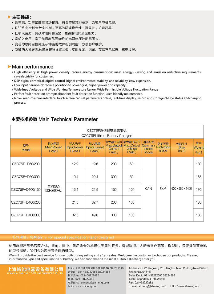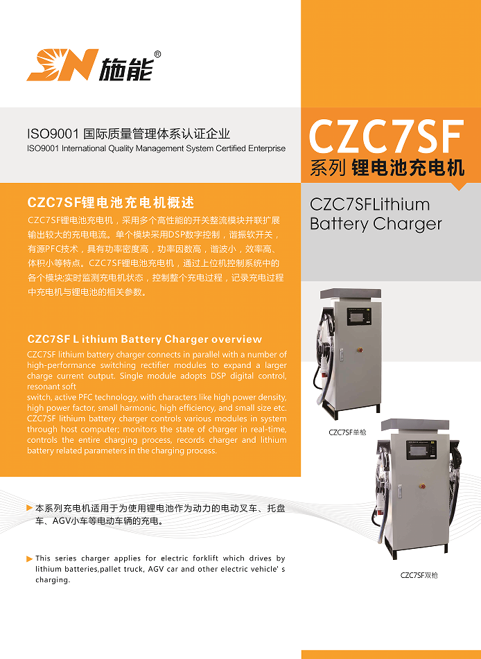 CZC7SF鋰電池充電機,采用多個高性能的開關整流模塊并聯擴展輸出較大的充電電流。單個模塊采用DSP數字控制,諧振軟開關,有源PFC技術,具有功率密度高,功率因數高,諧波小,效率高、體積小等特點。CZC7SF鋰電池充電機,通過上位機控制系統中的各個模塊;實時監測充電機狀態,控制整個充電過程,記錄充電過程中充電機與鋰電池的相關參數。