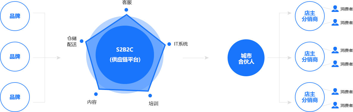 通過供應(yīng)鏈平臺(S),提供海量貨源給到渠道商 / 采購商(B),結(jié)合互聯(lián)網(wǎng)技術(shù)